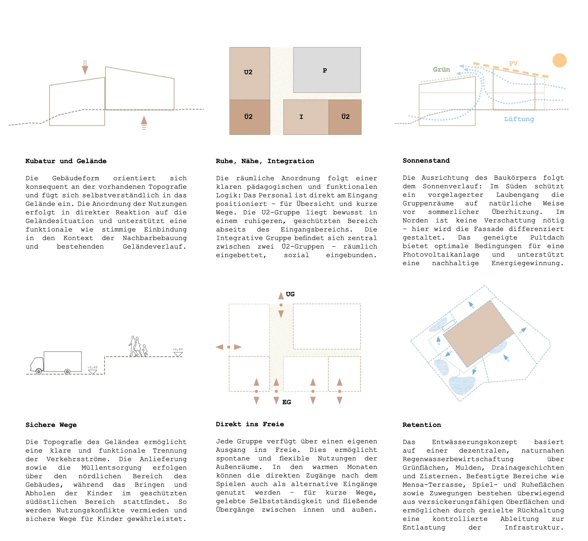 Die Mensa ist ein flexibler, lichtdurchfluteter Raum, der bei Bedarf mit dem Bewegungsraum kombiniert werden kann. Sie öffnet sich über große Verglasungen zum Außenbereich, der gut belichtet ist. Die Küche ist effizient angebunden, sodass kurze Wege zwischen Anlieferung und Nutzung entstehen. Der Außenbereich ist klar strukturiert, mit getrennten Zonen für Erschließung und Spiel. Die Spielbereiche sind nach Altersgruppen und Nutzung angepasst, mit Möglichkeiten zum Klettern, Schaukeln und für Ruhephasen. Das Regenwasserkonzept nutzt die natürliche Topografie zur nachhaltigen Entwässerung und Bewässerung der Pflanzflächen.