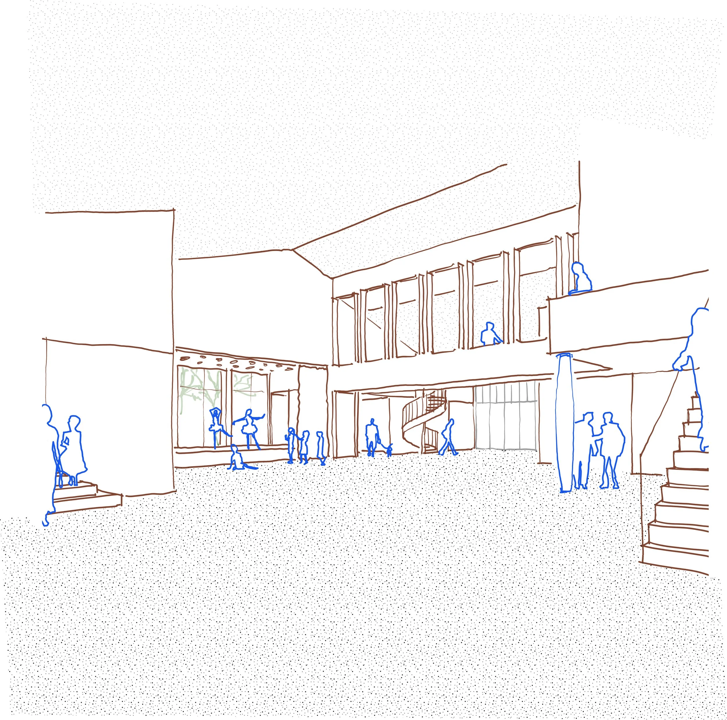 Statt eines Neubaus wurde die Entscheidung getroffen, vorhandene Strukturen weiterzudenken und brachliegende Potenziale zu aktivieren. So entsteht ein zukunftsfähiger Ort, der den Bestand respektiert und gleichzeitig behutsam transformiert.Im Zentrum des Entwurfs steht eine neu geschaffene „Gasse“. Ein lichtdurchfluteter, offener Raum, der alle Bereiche des Gebäudes miteinander verbindet. Sie dient als zentrale Erschließungsachse, Kommunikationsraum und flexible Nutzungsfläche zugleich. An Veranstaltungstagen wird sie zur Erweiterung der Mehrzweckhalle, an allen anderen Tagen prägt sie als lebendiger Innenraum den Alltag im Haus.