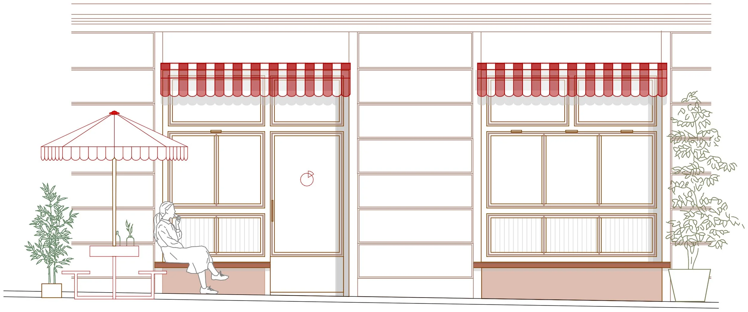 Auch die Fassade erstrahlt wieder im ursprünglichen Bild. Wo früher Fliesen die Ansicht bestimmten, zeigt sich nun der typisch Frankfurter Naturstein. Die neuen Holzfenster lassen sich sowohl hochschieben als auch kippen. Besonders praktisch: Direkt an der Theke kann man das Fenster öffnen, sodass Gäste ihren Espresso auch bequem von der Straße aus bestellen können. Und die breiten Fensterbänke verwandeln sich in gemütliche Sitzplätze – perfekt, um den urbanen Flair und das lebendige Treiben der Straße zu genießen.